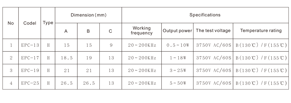 EPC型變壓器是為了適應(yīng)超薄型開關(guān)電源而設(shè)計的一款高頻變壓器。它擁有扁型的鐵氧體磁芯, 它的形狀能同時滿足電源變壓器高功率的要求和超薄體積的要求, 同樣也能適應(yīng)開關(guān)電源在溫升方面的要求,但對PCB板的要求會提高;它比EFD型變壓器在線包空間上有提高, 同時EMI性能和漏感、輻射等參數(shù)均優(yōu)于EFD型變壓器, 其它性能接近于EE型和EC型變壓器。EPC變壓器常用型號有EPC-10,EPC-13,EPC-17,EPC-19,EPC-25,EPC-30等。